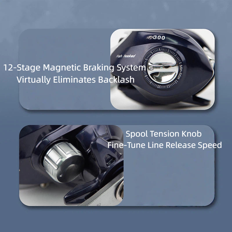 12-Stage Dual Magnetic Braking System – Zero Backlash Control Advanced dual-magnet configuration offers precise spool speed adjustment across 12 levels, virtually eliminating backlash even in windy conditions or with ultra-light lures.
