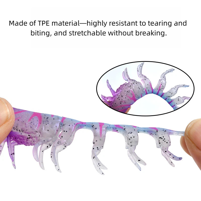 Ultrarealistisches Design – Dieser Softbait wurde mit viel Liebe zum Detail gefertigt, um Form, Textur und Bewegung einer echten Garnele nachzuahmen und erzeugt so eine lebensechte Aktion im Wasser, die selbst die vorsichtigsten Raubfische anlockt. Hochwertiges TPE-Material – Hergestellt aus hochwertigem TPE, das weich, flexibel und reißfest ist und eine außergewöhnliche Haltbarkeit gegen aggressive Stöße und wiederholten Gebrauch ohne Bruch bietet. Optimiert für optimale Leistung – Verfügt über eine schwimmfähige, leicht elastische Textur, die das Mundgefühl und die Bissfestigkeit verbessert und es für Fische äußerst schmackhaft und unwiderstehlich macht – ideal für das Angeln im Salzwasser und Süßwasser gleichermaßen.