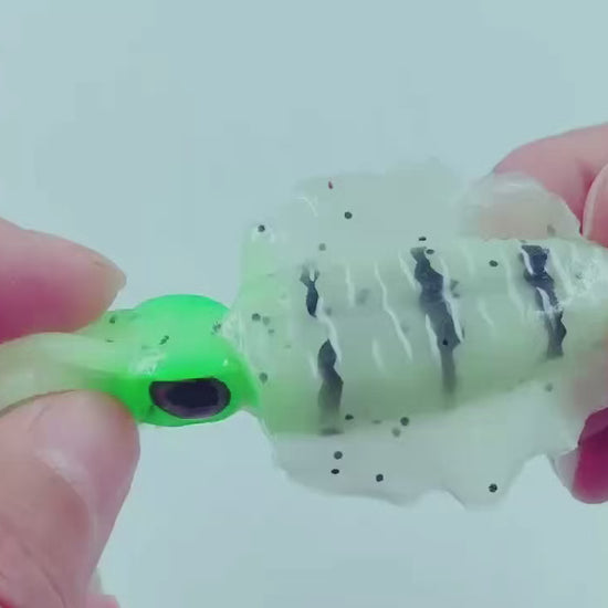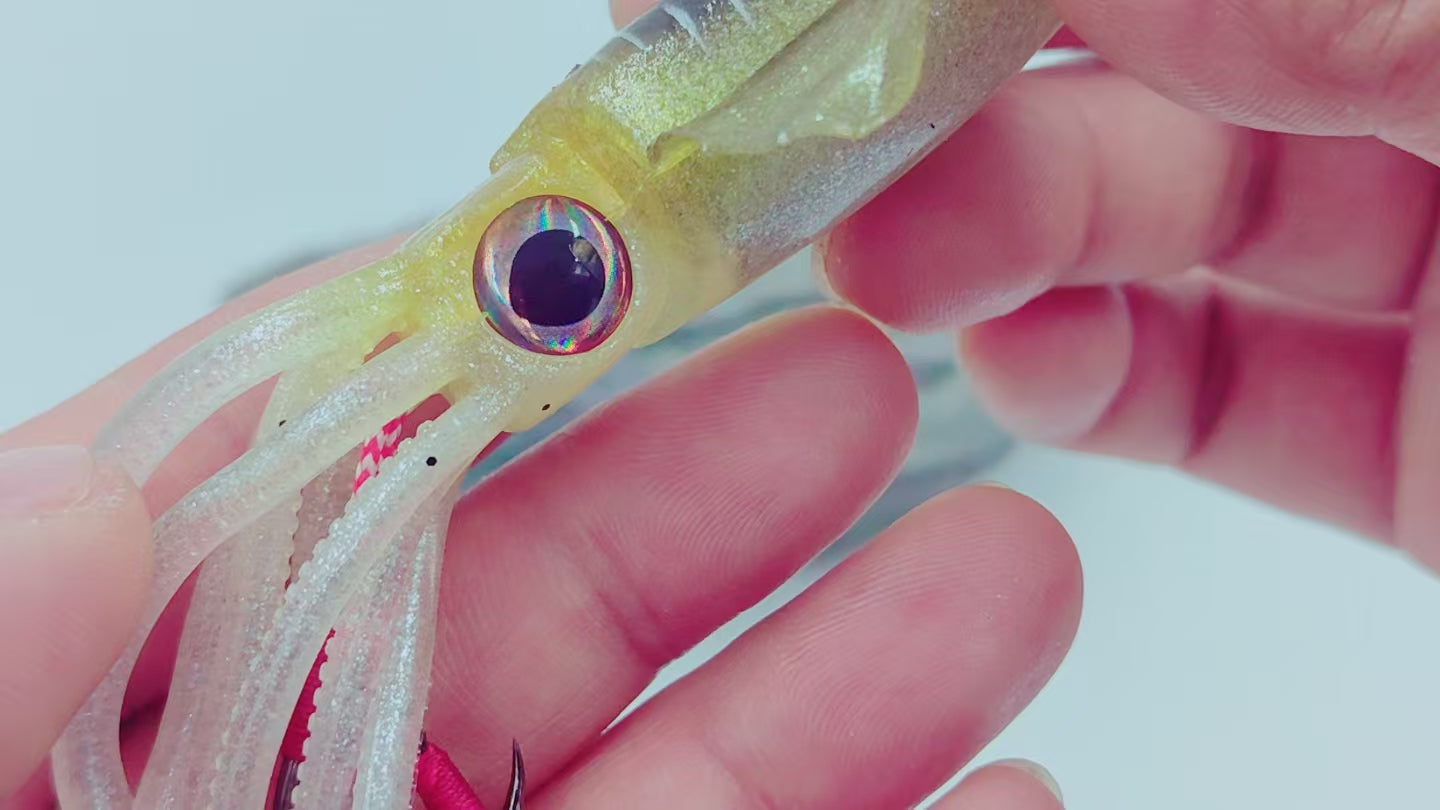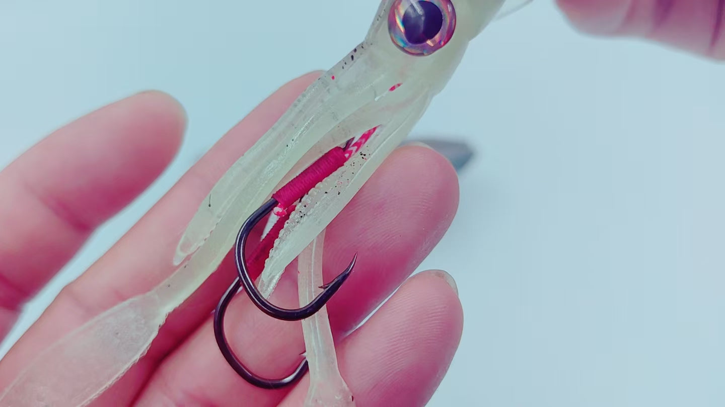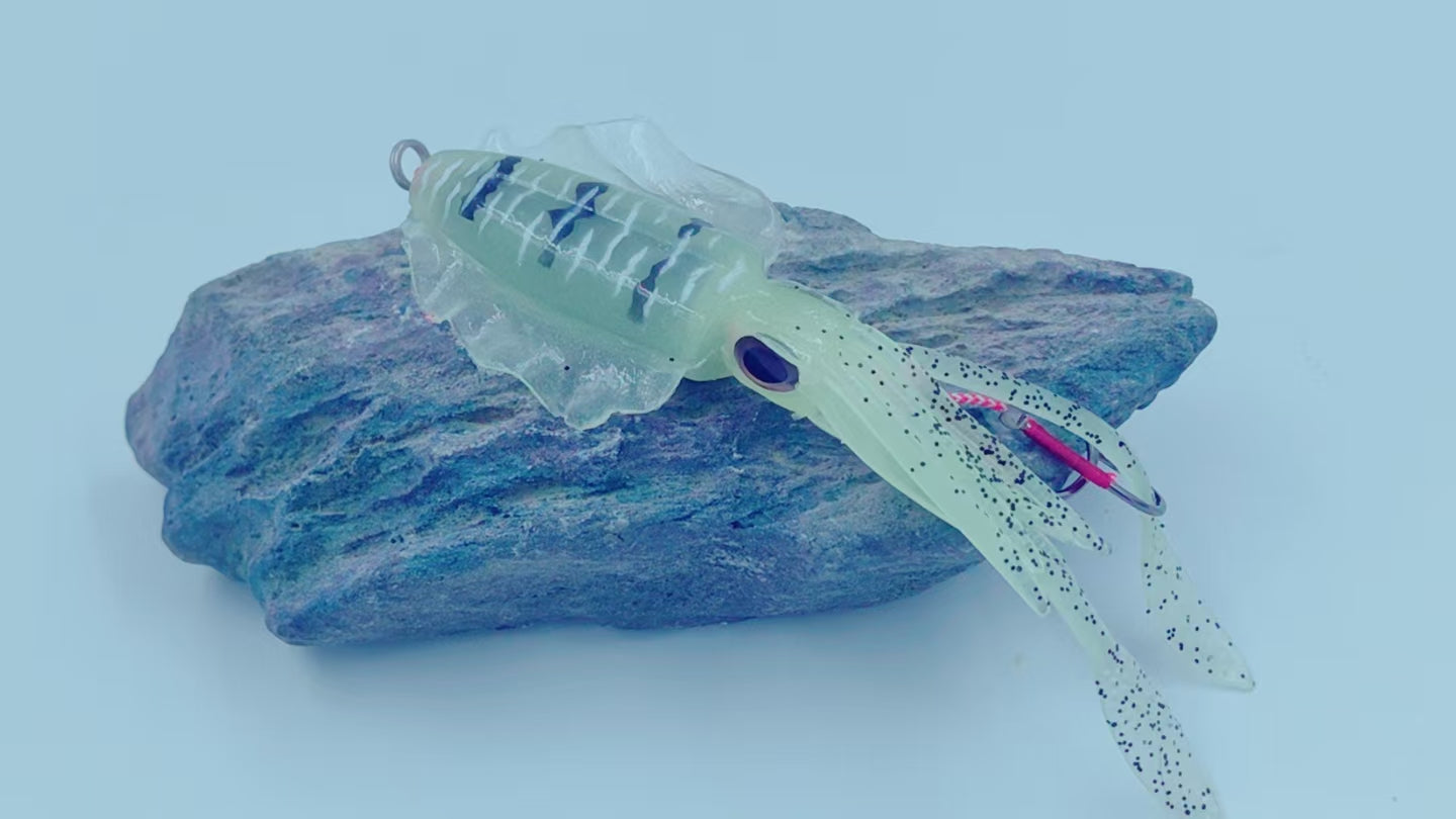 This lifelike soft squid lure features a realistic cuttlefish/octopus profile and a built-in single hook, meticulously designed for saltwater night fishing. Its glow-in-the-dark material enhances visibility in low-light conditions, making it highly effective for targeting squid, cuttlefish, and octopus. Lightweight yet properly balanced, it delivers natural movement in the water to trigger aggressive strikes. Ideal for both shore and boat anglers seeking high-performance cephalopod lures.